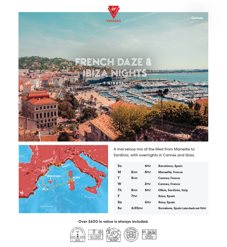 Set out from Spain to some of the most breathtaking seaside spots in the Med. A stop in the French metropolis of Marseille, an overnight in the glamorous seaside city of Cannes, a dose of Sardinian seduction in Olbia — and finishing it all with an overnight stay in the electric island of Ibiza.